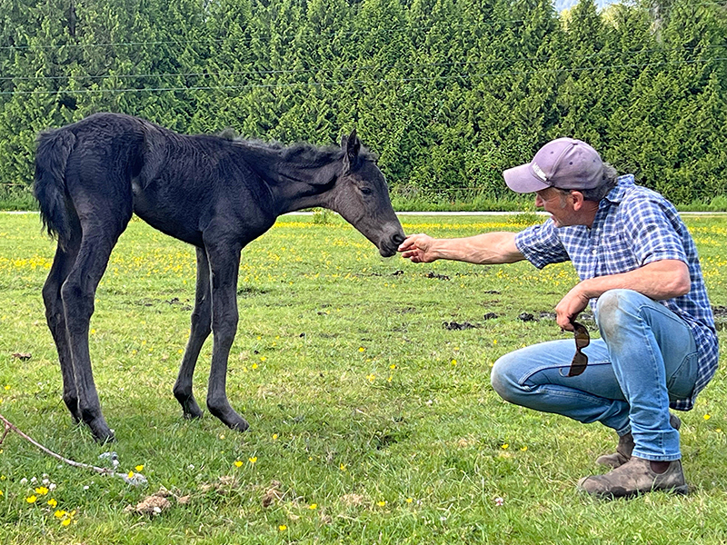 It was Terry Spring’s first foaling — and he was excited and nervous. Everything had been readied, and he was regularly testing the pH levels of the mare’s milk, which typically show a telltale drop when the birth is within 48 hours. But when no pH drop occurred, he grew anxious. Then, one afternoon while Terry was working in his garden, the pregnant mare bedded down in the grass next to him. He didn’t think much about it until a couple of his friends visiting from the local stable yelled out: “Looks like Glayva is going into labour!”