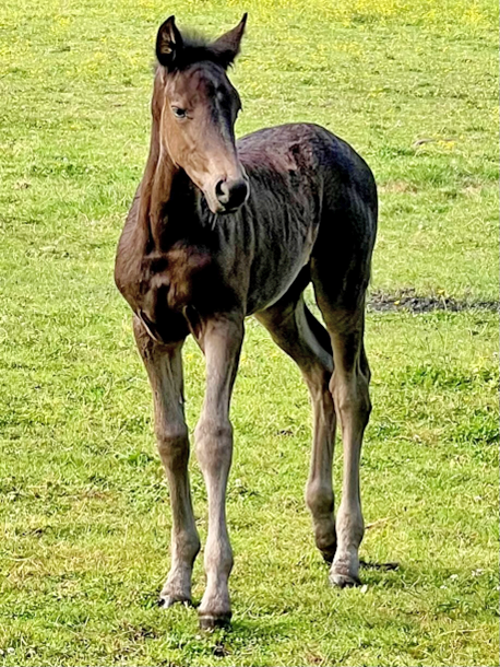 “When I saw its little head poking out of the sack and a sweet face with big, blinking eyes taking in the world around it, I was stunned,” said Terry. Within an hour the filly was standing on her long, spindly legs and beginning to nurse. “Judging by the length of her canon bones, she will likely be one of the taller, sportier Canadians.”