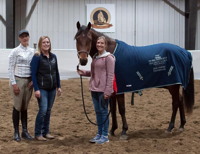 Main Photo: The high selling prospect under saddle, Nobody’s Fool, with (L-R) Jennifer Arbuckle of Valleyfield Farm (seller), Rebecca Berndt of Valleyfield Farm (seller), and Jolinda Botha (buyer).