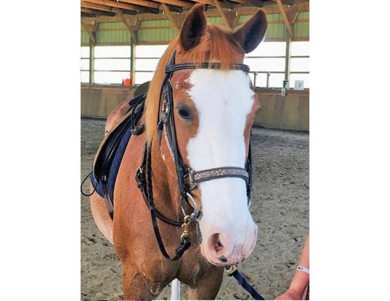This striking red roan splash-overo Paint mare, Rusty’s Moon (aka Rosie), has “been there, done that.” Rosie had worked as a lesson horse throughout her career, and landed at VTEA when her current owner began volunteering with them over five years ago. When used for hippotherapy, Rosie is relied upon to pro-vide steady and robust movement. Her personality shines when she is working with some of VTEA’s more timid riders. Rosie touched the heart and soul of one rider in particular: that of Fran McGuckin.