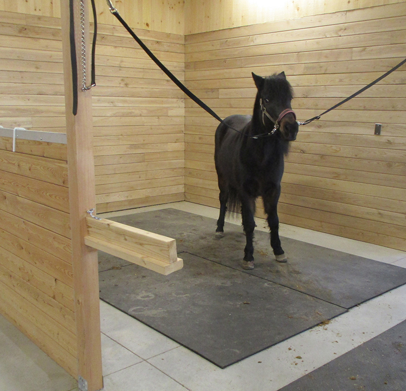 Therapy pony Pickles in a wheelchair-accessible grooming stall, with detachable saddle rack in position. Photo: Daphne Davey