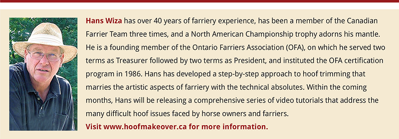 The shortest distance between two points is a straight line. With this in mind, it is absolutely mandatory that the heels be trimmed back to the widest point of the frog. The toe must be shortened and the quarters must also be brought down to the same plane as the sole.