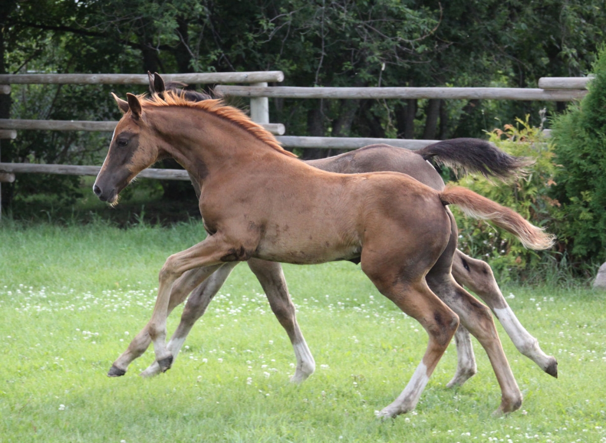 Having Fun! KWPN foals, Honor (foreground) and High Roller, show off their athleticism as they gambol around the pasture in tandem. Photographed by Denise Gordeyko of BC.