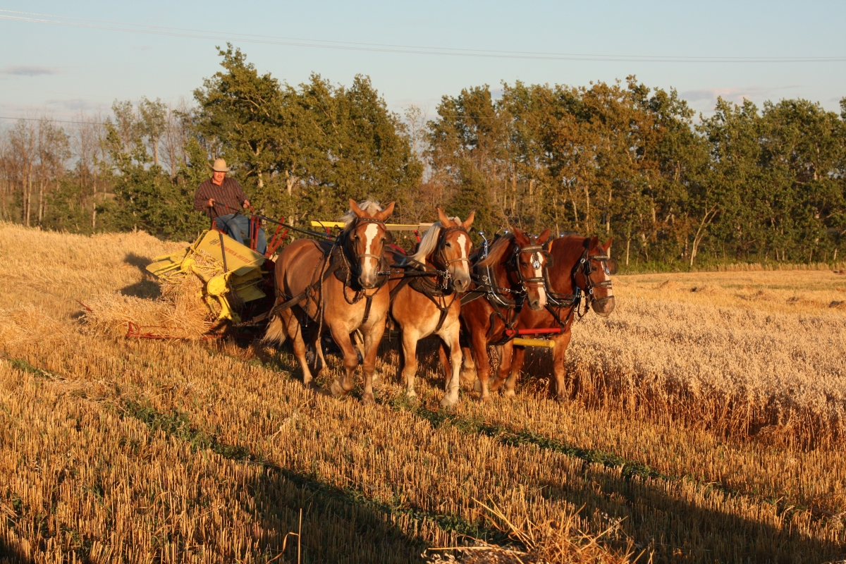 All in a days work Belgians Gypsy, Candy, Polley, and Pete, owned by Bruce Coleman, have become accustomed to pulling a variety of horse-drawn farm equipment, including this binder. “This year marks the first year oats were seeded on this land in quite some time (again with horses),” says photographer Norbert Stoll of BC. “It was an arduous task but, with the pooling of resources, equipment was acquired and borrowed to make our version of Threshing Day in the North Peace live on.”