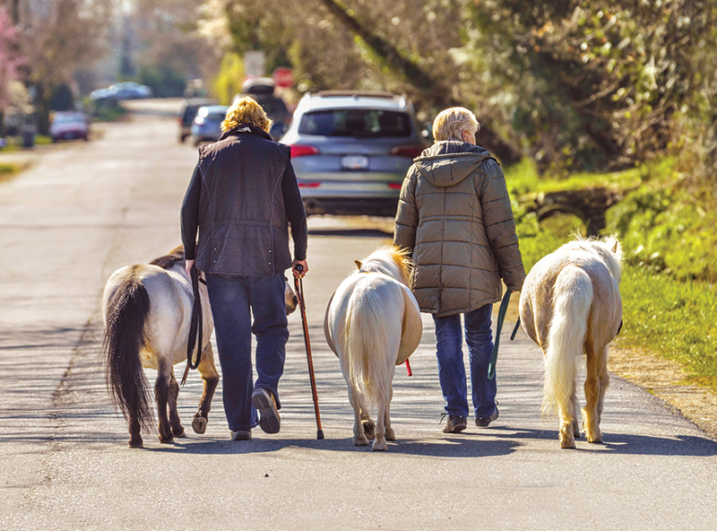 Southlands residents and their minis out for a stroll. In addition to horses large and small, a mini donkey, chickens, goats, sheep, and numerous other animals call Southlands home. Photo: Ingo Neufeld