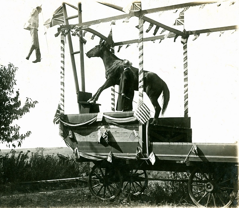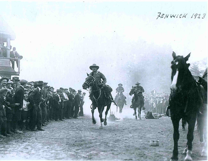 “One of the skits was catching and hanging a horse thief,” says Thomas’s son, Tom Bishop (Tom Sr.). “The horse thief was always Dad’s younger brother. They put a birch pole along the track in front of the grandstands and they would haul him up from a rope on the horse and then shoot him.”