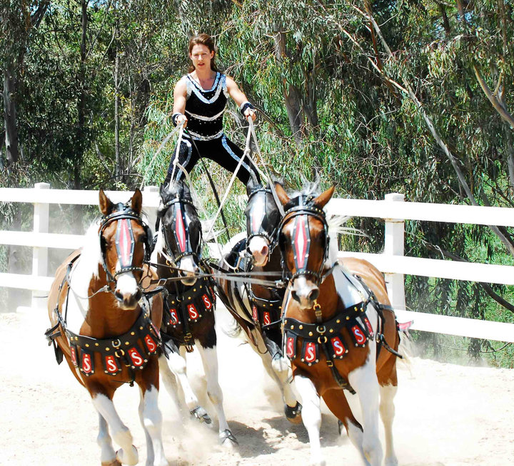 In addition to trick riding and stunt work, Sally Bishop also performs Roman riding demonstrations at events throughout Canada and the U.S. Photo courtesy of Tom Bishop’s 4B Ranch Productions