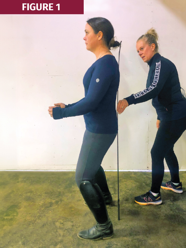 An equestrian athlete’s postural alignment is crucial for balance and effective communication with the horse. A rider’s dynamic posture is constantly changing with the horse’s movement. It should consist of a tall, neutral spine, shoulders down and back, a deep seat, and legs that hang against the horse’s sides with engagement and without gripping. While static, if you drop a plumb line, correct posture vertically aligns the ear, shoulder, hip, and heel, and allows the rider’s body to balance in motion (see Figure 1).