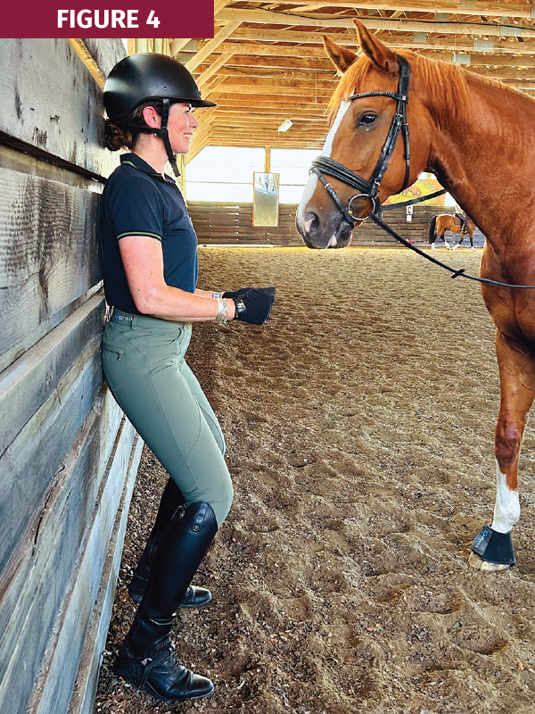 2. Stand against a wall with knees slightly bent, rear end, shoulders, and head touching the wall (your lower back will not necessarily touch the wall); this is correct posture and alignment. Look straight ahead to the opposite wall and imagine a figure-eight and trace it in both directions with your eyes while keeping your head still. You can also do this mounted at the halt (see Figure 4).